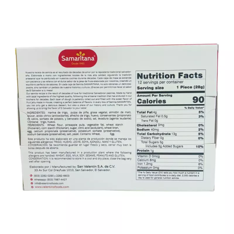 Discover the Flavor of El Salvador, Handcrafted with Heart Our Story: Valentino foods with Samaritana is more than a brand — it’s a tribute to Salvadoran tradition, craftsmanship, and community. Our journey began over 30 years ago in El Salvador, with a passion for preserving and sharing the authentic flavors of our culture. What started as a small bakery has grown into a trusted brand offering a variety of artisan-made products: from traditional sweet breads like “semita” to bold sauces crafted with local ingredients and love. Mission & Vision: Our mission is to bring natural, high-quality, and nostalgic Salvadoran flavors to every table — locally and internationally. We envision a world where traditional foods are valued, and where small producers like us can thrive sustainably. Our Added Value: Handcrafted by Salvadoran women with traditional recipes Made with natural, regionally sourced ingredients Artisan processes that maintain the product's authenticity Shelf-stable and easy to ship Production Capacity & Safety Standards: We operate under rigorous food safety and hygiene standards, with traceability systems in place and continuous quality controls. Our facility is equipped to fulfill both small batch orders and larger export volumes, while preserving artisanal quality in every product. Social & Environmental Responsibility: At Valentinofoods, we believe in business with purpose. We work directly with regional producers and support women-led employment. our ingredients are selected responsibly to mantein the quality of our products Direct Impact: Our brand supports over 30 Salvadoran families by creating stable jobs, especially for women and youth. Every purchase helps build a future where tradition, sustainability, and opportunity go hand in hand